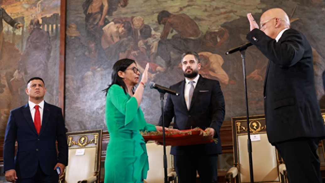 一邊,是全國代表大會的宣誓儀式。德爾西·羅德裡格斯站在議會大廳裡,提到玻利瓦爾,提到榮耀,提到悲痛與責任。那是一種拉美政治裡極具象征意味的場景,語言厚重,情緒飽滿,像是在為一個被強行打斷的國家敘事續寫開頭。