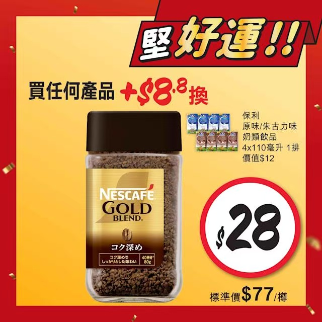 急冻食品区则主打品鲜精选急冻丸系列,款式多样,方便快捷,适合用于打边炉或日常小菜。饮品选择包括备受欢迎的雀巢咖啡金牌特浓即溶咖啡,香气浓郁,以及淳茶舍茶类饮品,提供无糖或低糖选择,迎合健康饮食趋势。