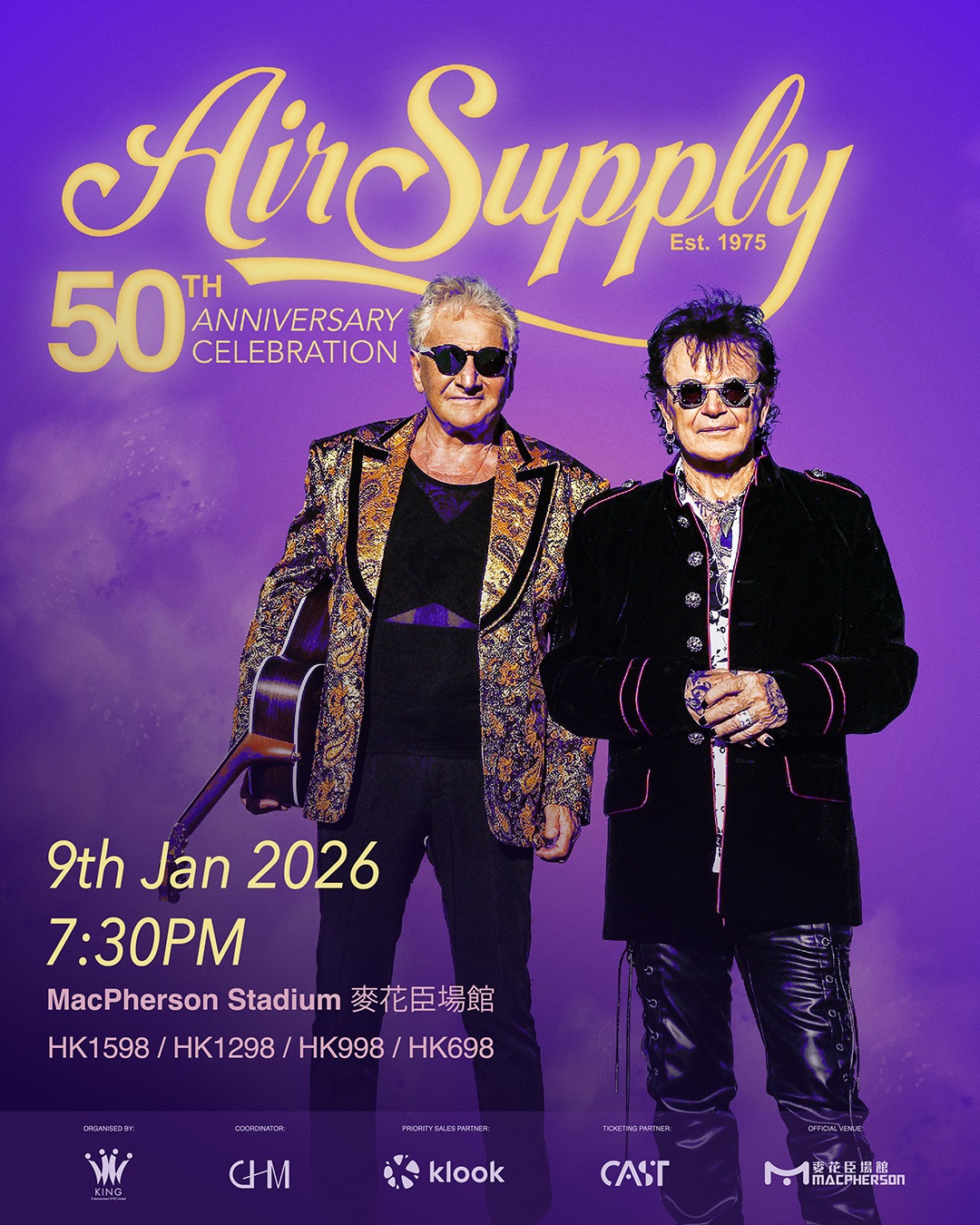 亮點:澳洲傳奇軟搖滾樂隊Air Supply成軍五十周年紀念巡演。樂迷可期待現場重溫《All Out of Love》、《Making Love Out of Nothing at All》等跨越時代的經典情歌,適合全家跨代共賞的懷舊音樂之夜。