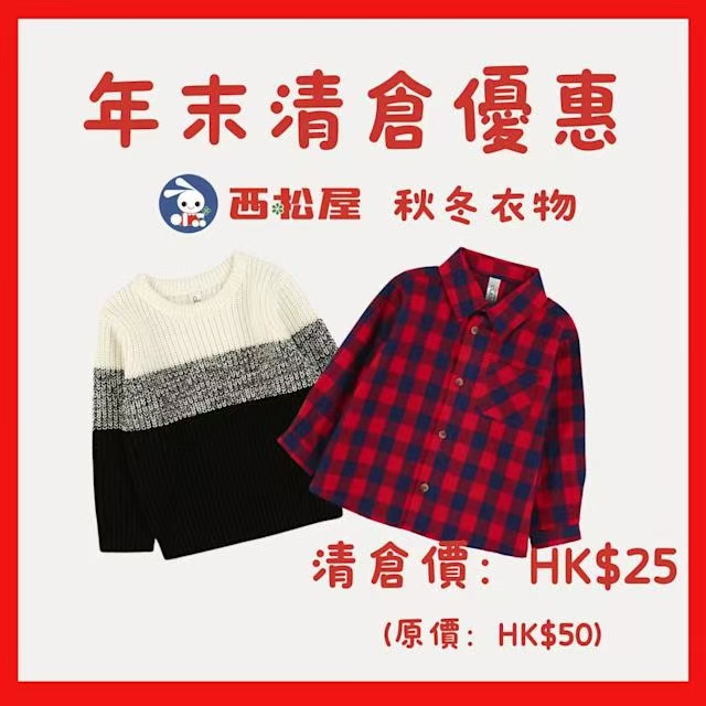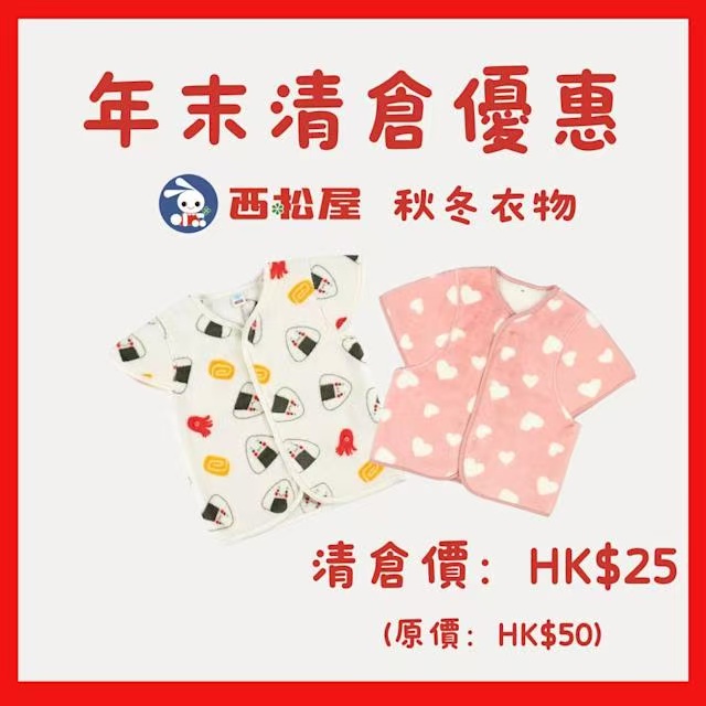 日本知名童裝品牌西松屋的授權零售商Hailey's House,近日於全港九間門市同步推出大型清倉優惠,多款指定秋冬衣物以半價發售,入門價低至港幣25元,讓家長能夠以實惠價格購入高品質的日系童裝。本次優惠涵蓋外出服、家居服及各類保暖衣物,所有減價貨品數量有限,售完即止,預計將吸引不少家庭趁機添置子女秋冬裝束。