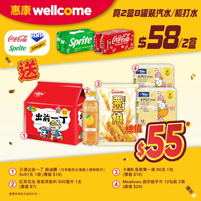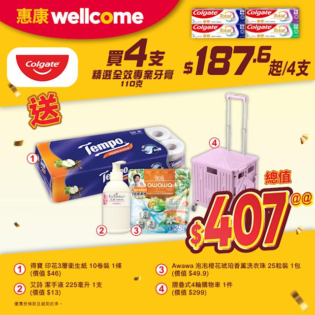 其中個人護理優惠方面,顧客選購4支高露潔精選全效專業牙膏,即可獲贈總值$407的豐富禮品套裝,助消費者一站式儲備日常口腔護理用品。飲品區則推出汽水促銷,購買2盒8罐裝可口可樂、芬達、雪碧、玉泉汽水或梳打水,即送總值$55的精選禮品。