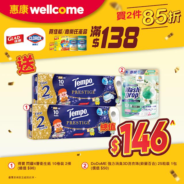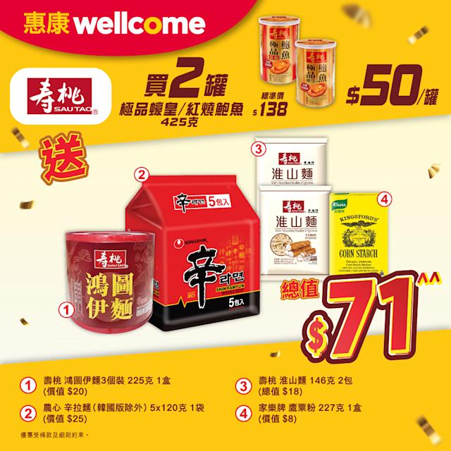 此外,家居清潔產品同樣參與本次推廣,選購佳能或高樂氏產品滿$138(可享2件85折優惠),即可獲贈總值$146的家居用品套裝。罐頭食品類別則精選壽桃牌極品蠔皇或紅燒鮑魚(425克),購買2罐即送總值$71的烹飪食材禮包。