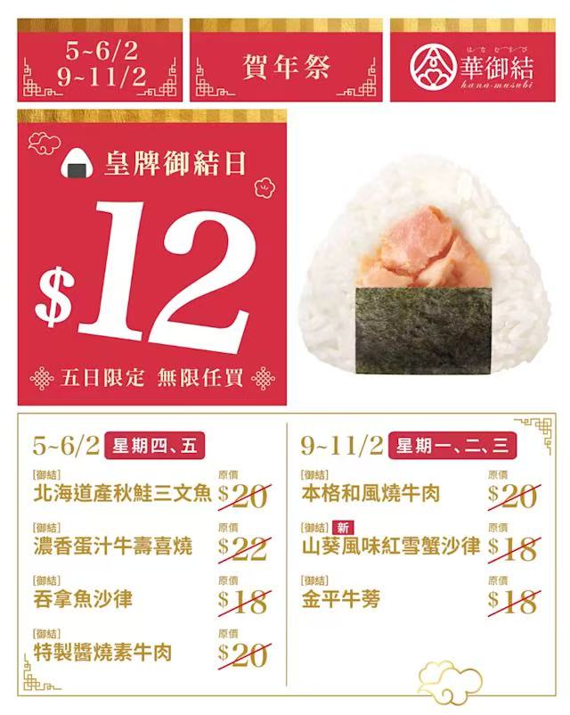 根據品牌公佈的日程,首輪優惠將於2月5日(星期四)及6日(星期五)展開,涵蓋四款深受歡迎的御結:原價20港元的「北海道產秋鮭三文魚」、原價22港元的「濃香蛋汁牛壽喜燒」、原價18港元的「吞拿魚沙律」,以及同為原價20港元的「特製醬燒素牛肉」。上述產品均選用日本產地食材及傳統配方製作,日常銷情穩定。
