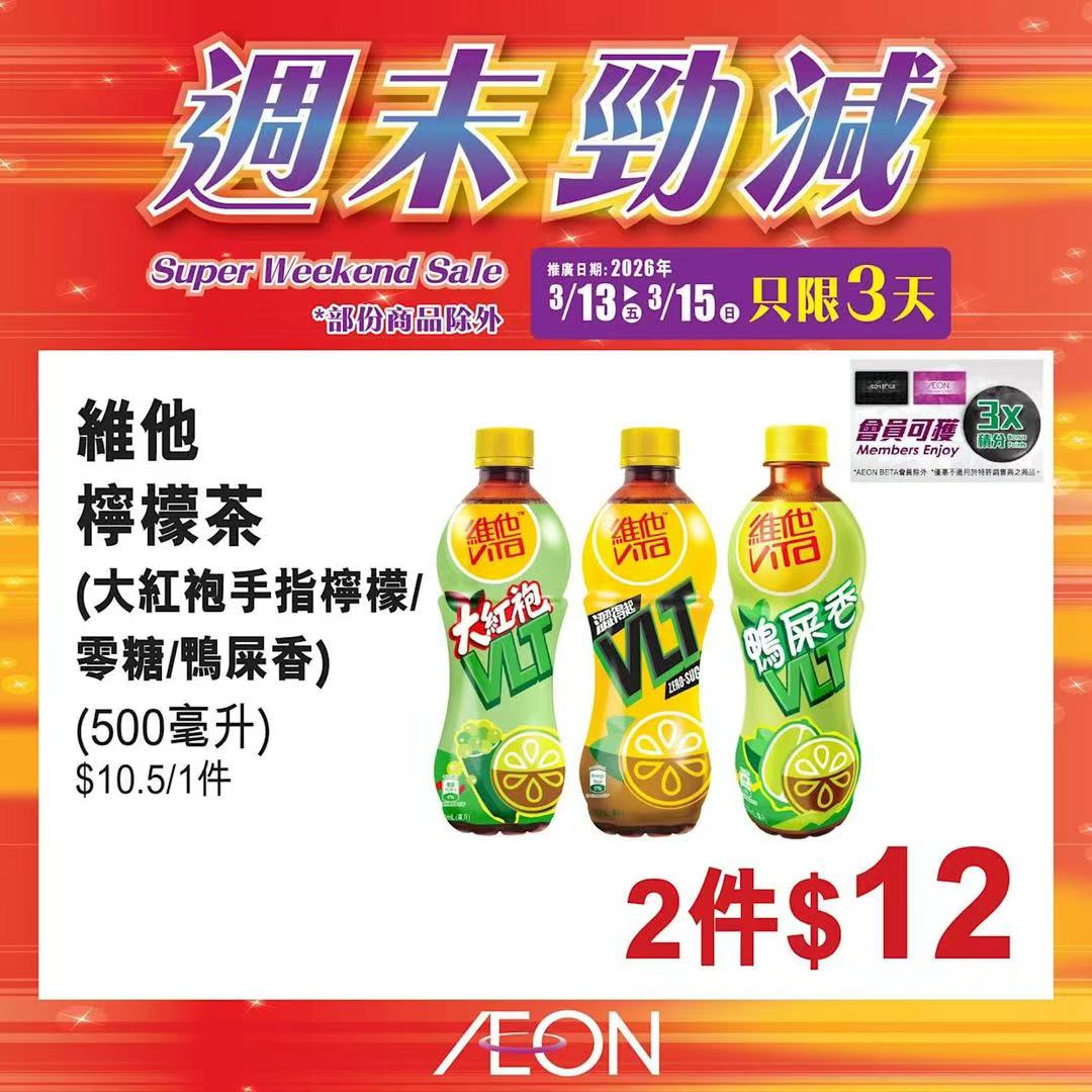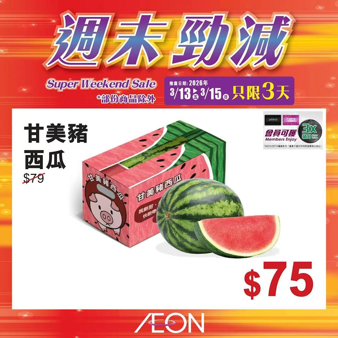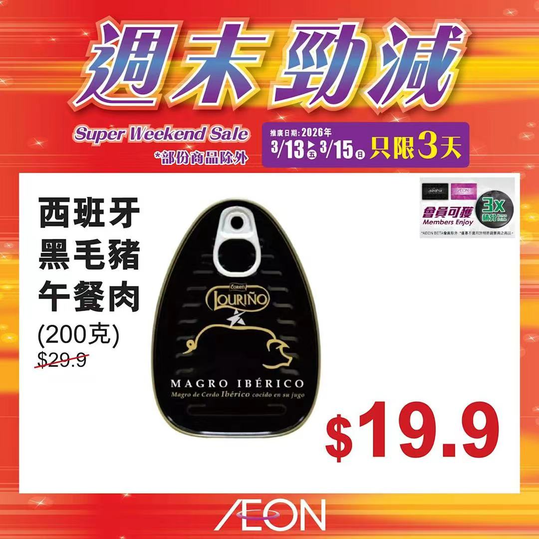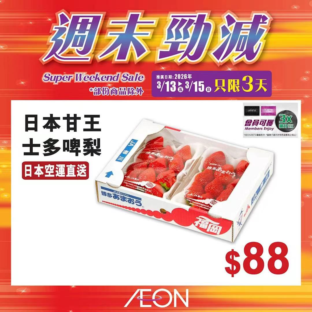 踏入三月中旬,Aeon再度推出「周末勁減」優惠活動,多款人氣食材及飲品以震撼價發售,為精明消費者提供入貨良機。據了解,本次推廣期由即日起至2026年3月15日,顧客須透過Aeon Mobile應用程式選購,方可享有上述優惠價格。