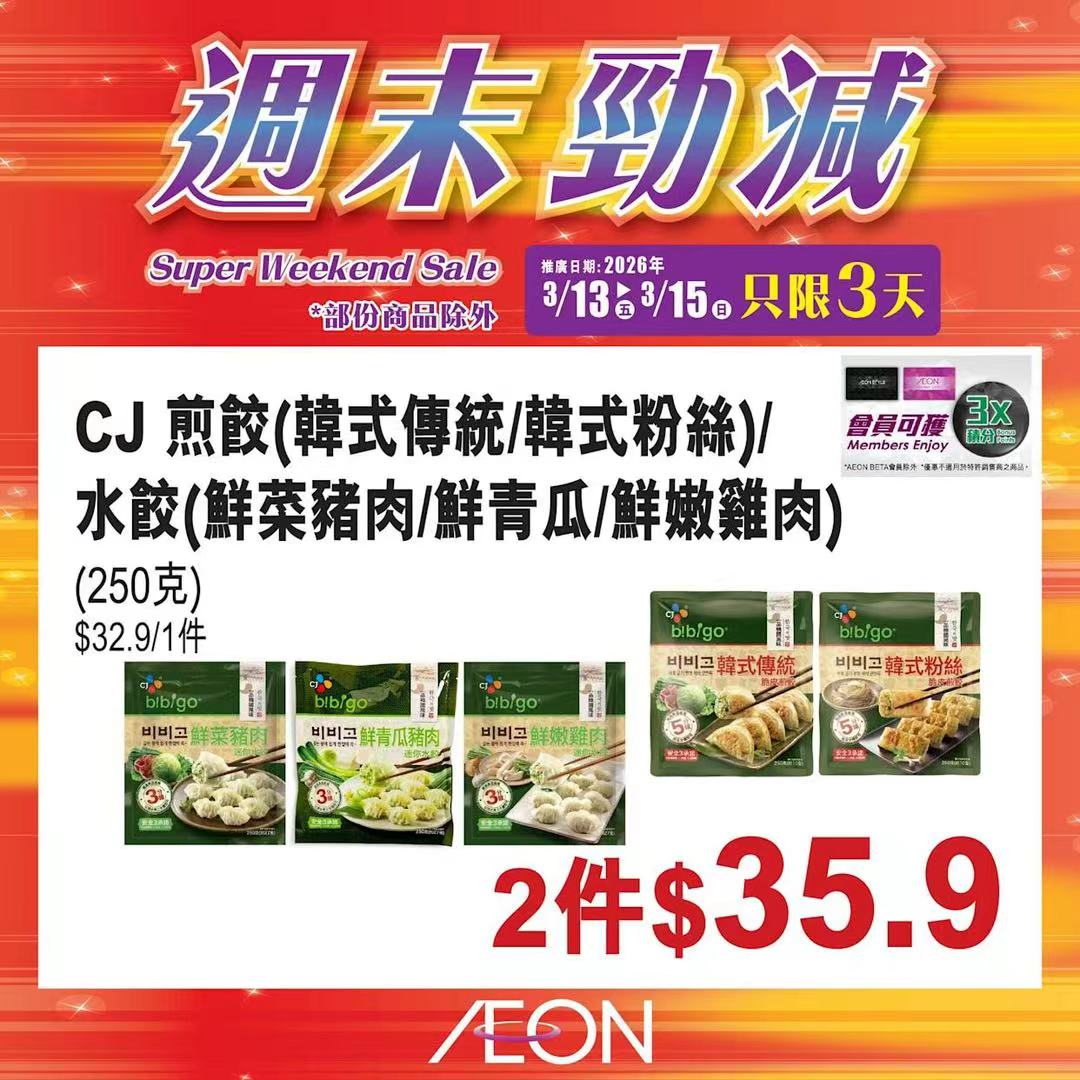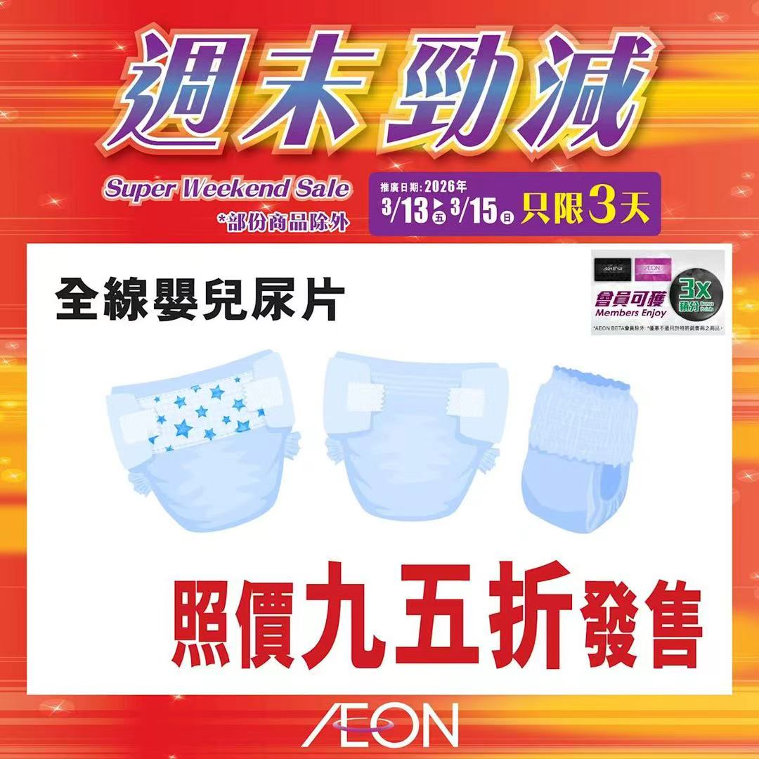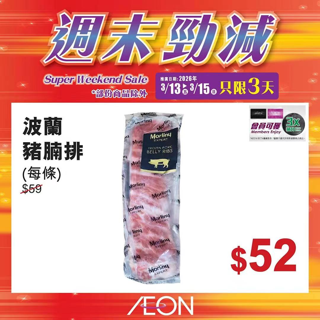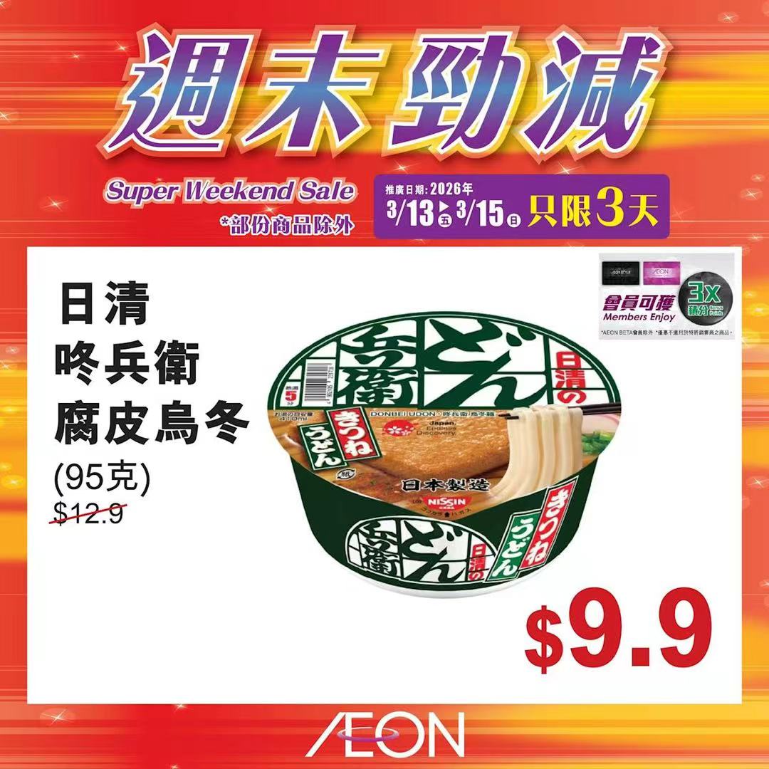 踏入三月中旬,Aeon再度推出「周末勁減」優惠活動,多款人氣食材及飲品以震撼價發售,為精明消費者提供入貨良機。據了解,本次推廣期由即日起至2026年3月15日,顧客須透過Aeon Mobile應用程式選購,方可享有上述優惠價格。