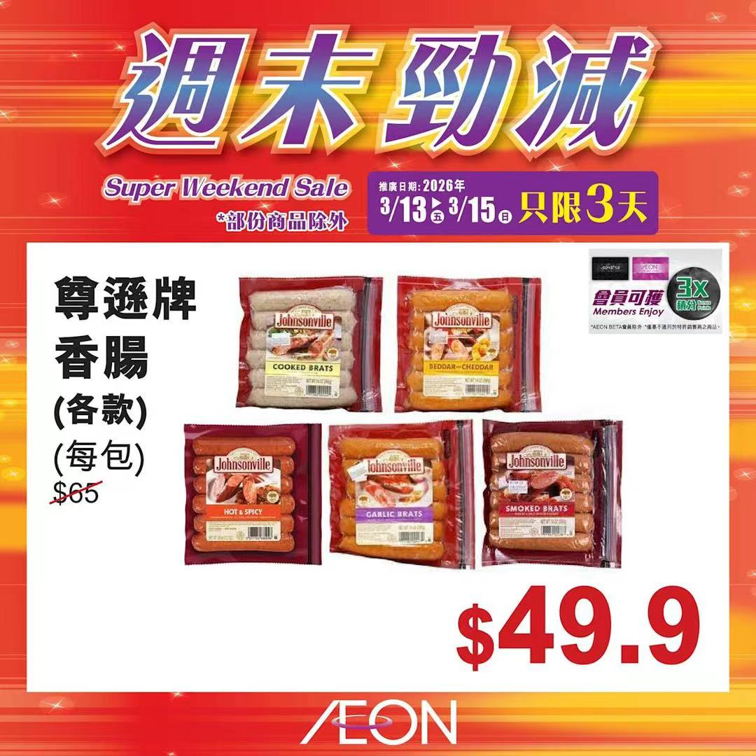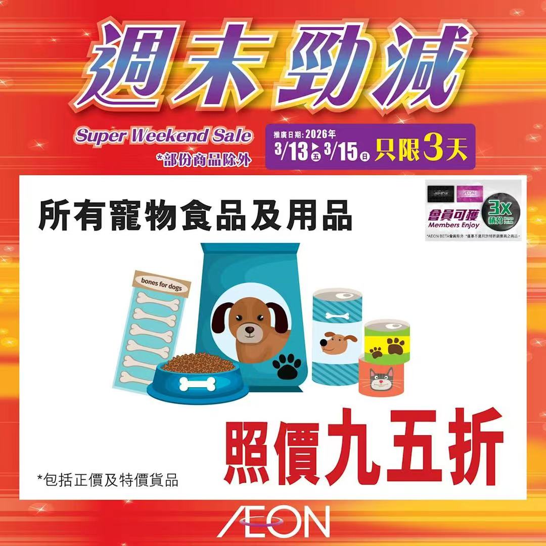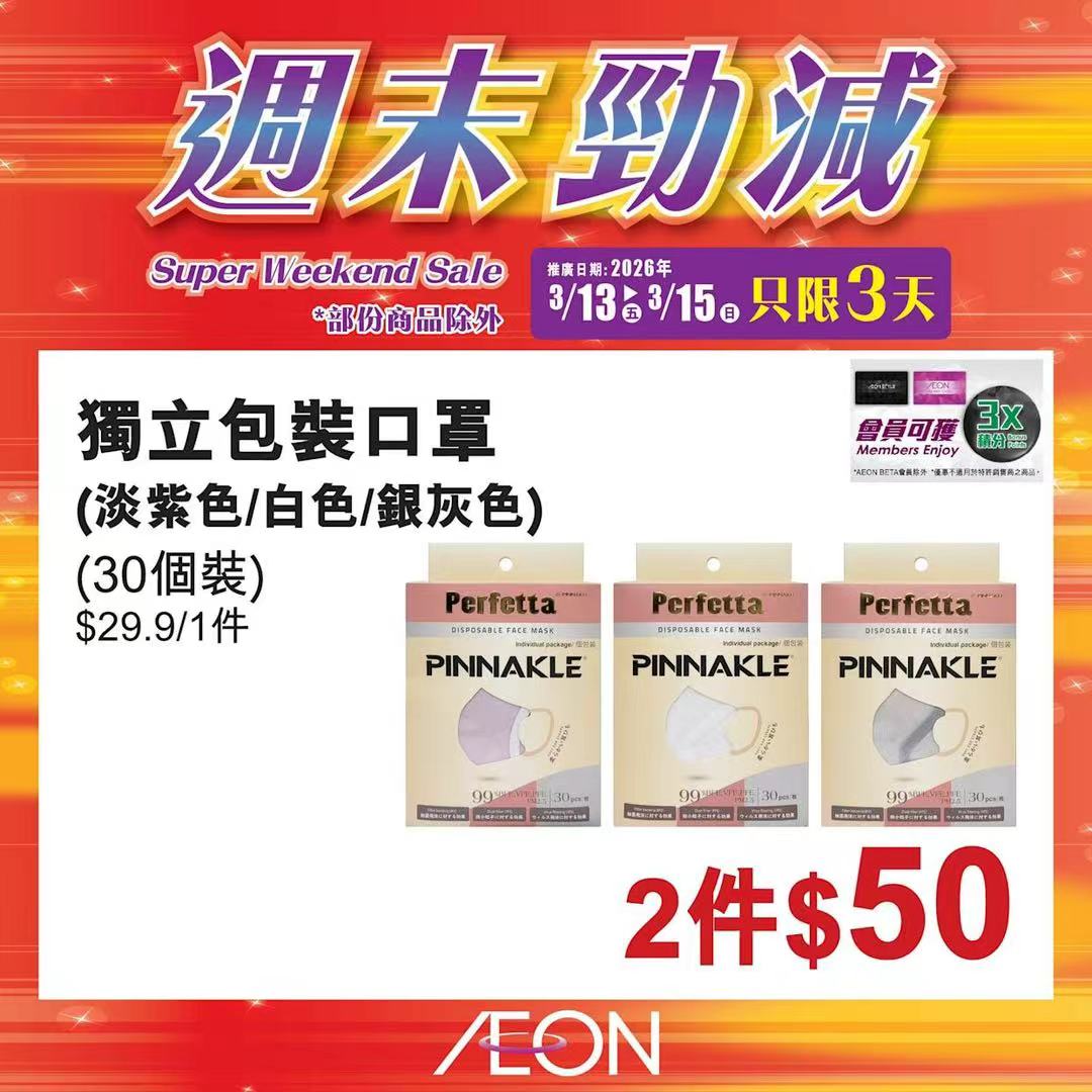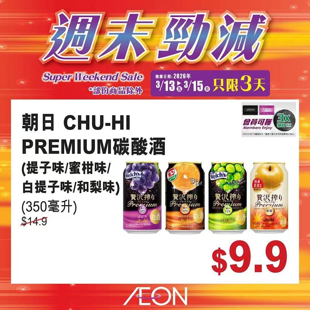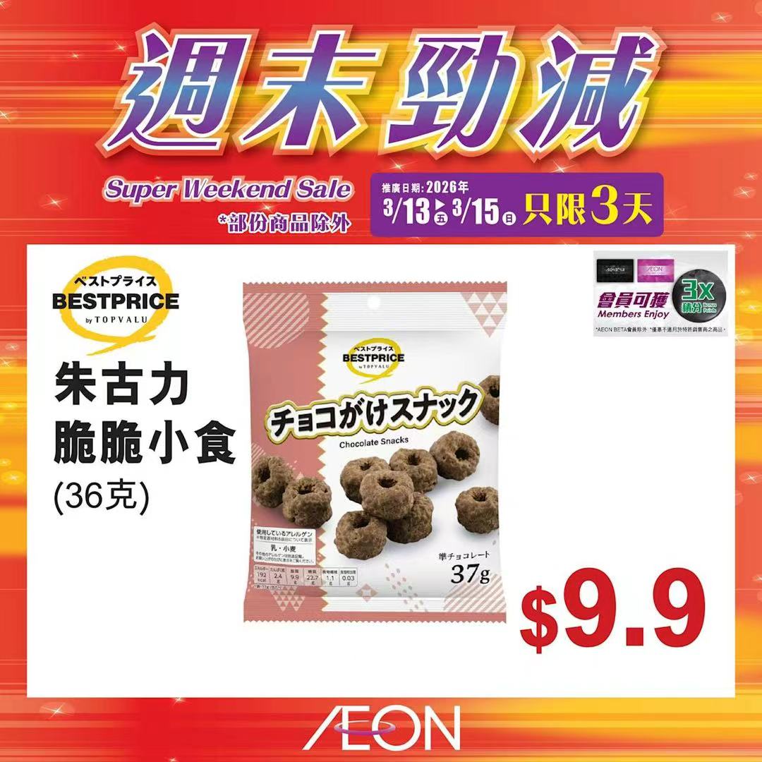 踏入三月中旬,Aeon再度推出「周末勁減」優惠活動,多款人氣食材及飲品以震撼價發售,為精明消費者提供入貨良機。據了解,本次推廣期由即日起至2026年3月15日,顧客須透過Aeon Mobile應用程式選購,方可享有上述優惠價格。