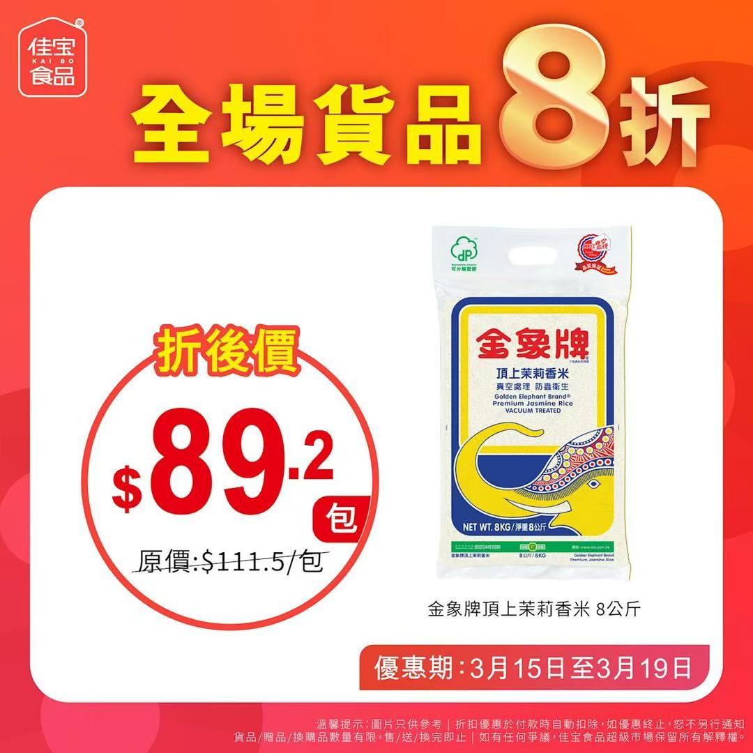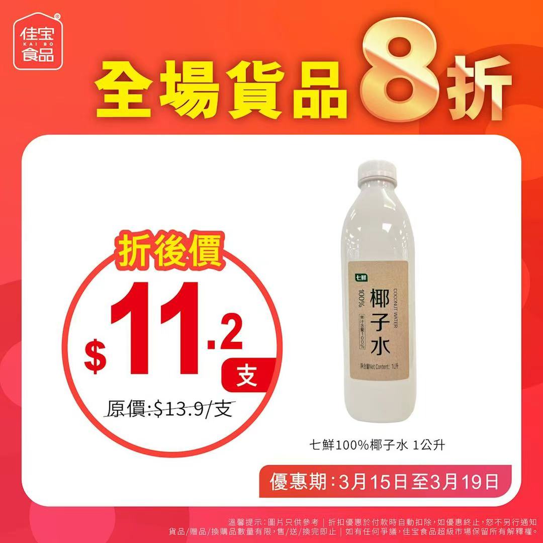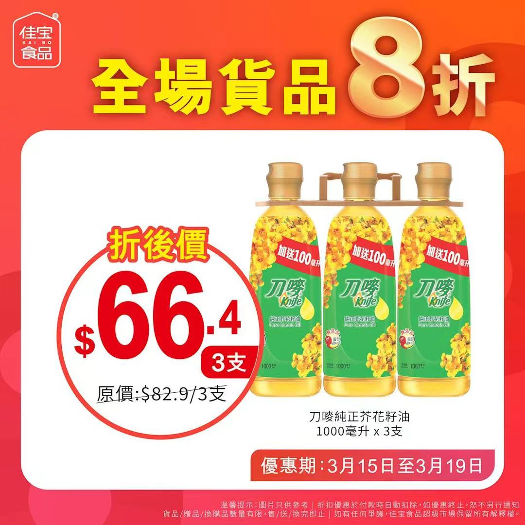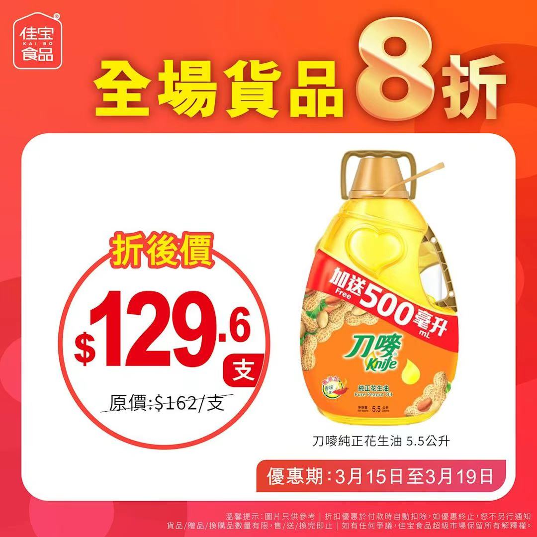 佳宝食品超級市場向來以價格實惠見稱,本次全場八折優惠被視為繼農曆新年前後的又一輪「快閃」促銷。優惠期由即日起至3月7日,全線分店同步進行,惟海濱花園分店除外。店方提醒,優惠適用於大部分貨品,但部分特價產品數量有限,售完即止,有興趣的市民宜把握最後兩天機會到場選購。