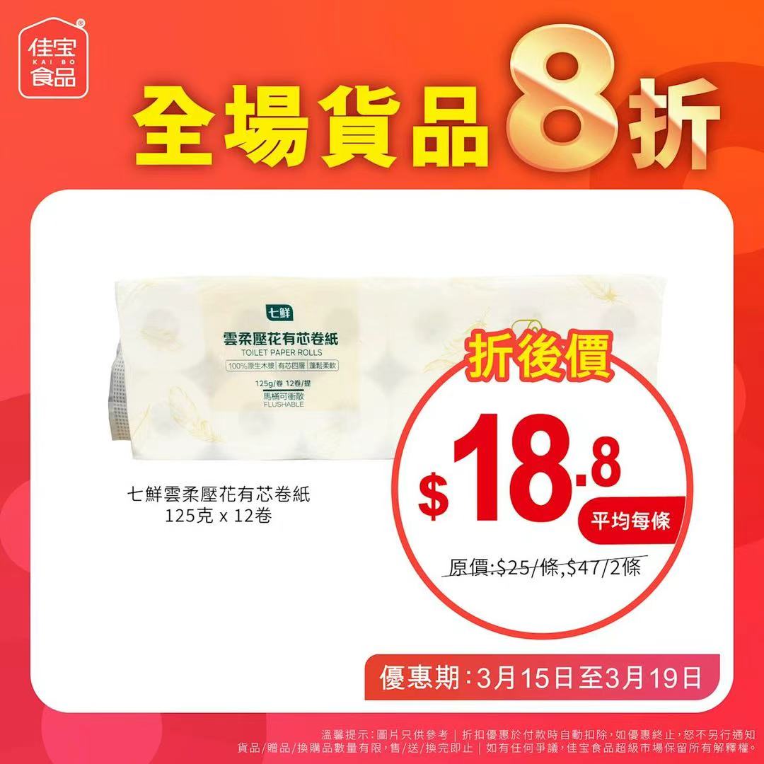 除了食品,家居消耗品同樣是今次優惠的亮點。七鮮雲柔壓花有芯卷紙(125克×12卷)折後價平均每條僅18.8元,吸引不少市民一次過購買兩至三條。有正在選購廁紙的消費者表示,這類日用品的價格經常波動,「見到咁抵,梗係買定多啲擺喺屋企」。