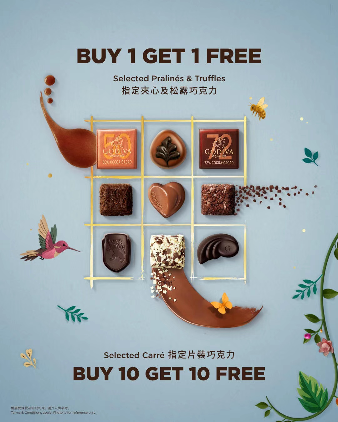除了夾心及松露巧克力外,指定散裝片裝巧克力更設有「買十送十」優惠。GODIVA片裝巧克力備有多種濃度選擇,由濃醇馥郁的85%黑巧克力、苦甘平衡的72%及50%黑巧克力,以至絲滑甜美的牛奶巧克力,全面迎合不同味蕾的喜好。每片均採用獨立包裝設計,方便巧克力愛好者隨時隨地享受香醇誘人的奢華滋味。