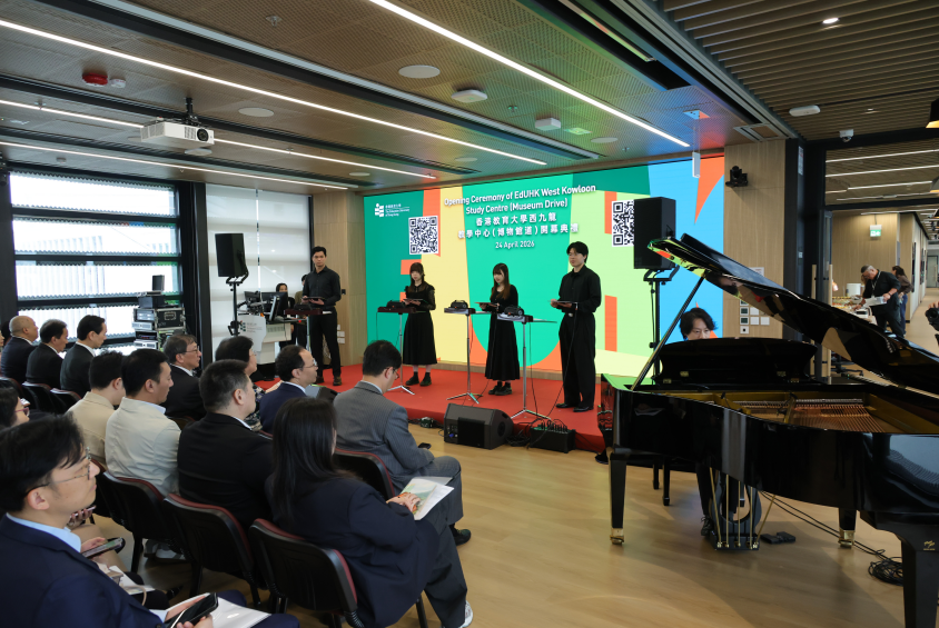 典禮以一場跨界互動音樂演出揭開序幕。教大文化與創意藝術學系講師兼鋼琴家李璟輿博士,聯同「當代音樂與數碼樂器實驗室」成員,透過e-Orch Ambience應用程式,結合鋼琴、iPad及現場觀眾的智能手機,共同演繹全新作品《地緣韻》。該曲目由文化與創意藝術學系副系主任(研究)、作曲家兼指揮梁智軒博士專為本次開幕典禮創作,素材取自西九文化區的真實聲景,將維港海風、建築物的空間迴響,以及場館內的獨特氛圍融入音樂之中,為來賓營造出沉浸式聽覺體驗。典禮壓軸則由教大爵士合唱團Lacov帶來精彩演出,為新教學中心的啟用劃上圓滿句號。期間,陳智思先生亦向現場觀眾發表演說,分享他對城市藝術與香港文化發展的深刻見解。