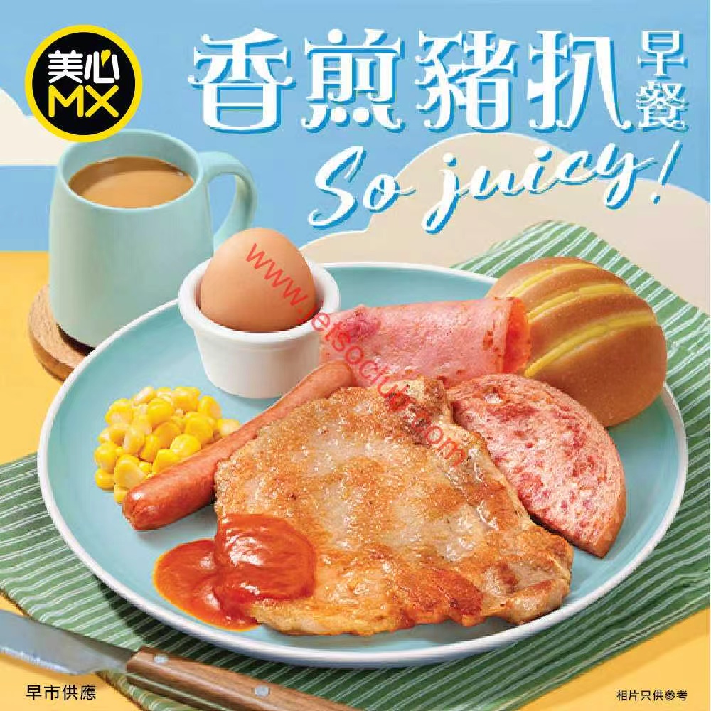 另外,美心MX同步推出「香煎豬扒早餐」,僅於早市供應。該早餐適用於全線美心MX分店(大會堂及西九龍站分店除外),同樣為限量發售,售完即止。店方提醒,相關優惠條款及細則需參閱店內宣傳物料,而餐點圖片只供參考,最終出品以實物為準。有經常光顧的市民表示,香煎豬扒早餐配搭飲品及主食,性價比高,期望分店能增加供應量。美心MX發言人未有進一步透露早餐的具體價格,顧客需親臨分店查詢。
