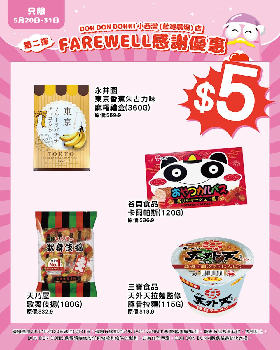 【DonDonDonki】小西灣店Farewell優惠第二彈 精選零食低至$1更多玩具精品低至7折! 日期:即日起至2025/05/31 地點:Don Don Donki分店