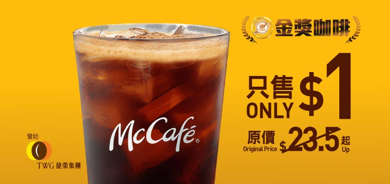 同時,McCafé於上午11時後推出$1 McCafé熱 / 凍即磨黑咖啡,只需 $1就享用到採用的100%「雨林聯盟認證」house blend咖啡豆Cocoa Tazza的「金獎咖啡」!