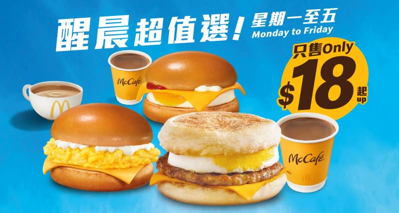 麥當勞App亦會繼續供應$18起醒晨超值選配飲品,5款不同口味的漢堡飽包括$18麥芝蛋飽配飲品、$20火腿扒芝士飽配飲品以及$23魚柳飽、炒雙蛋飽或豬柳蛋漢堡配飲品。