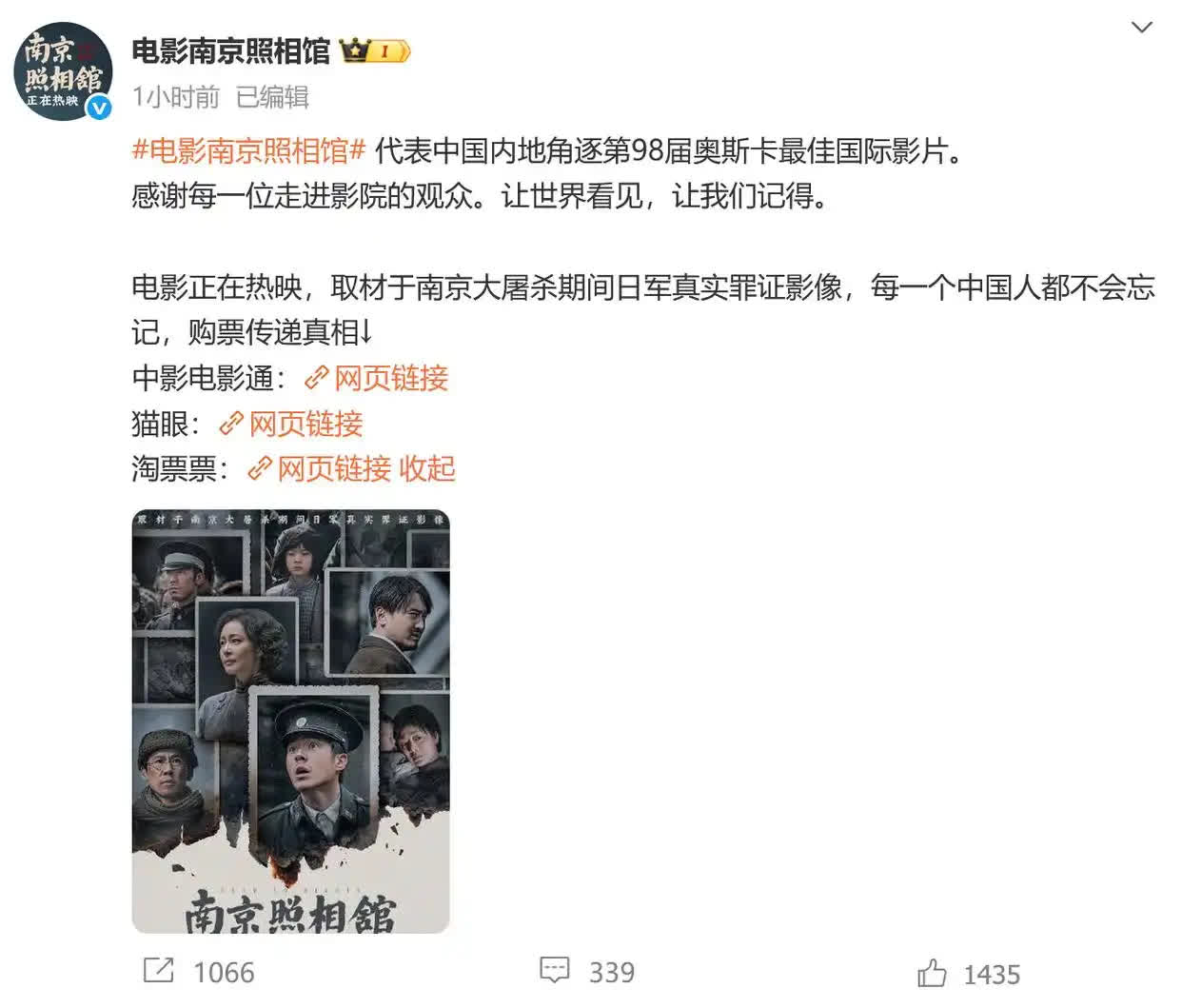 26日,電影《南京照相館》微博發布消息,《南京照相館》代表中國內地角逐第98屆奧斯卡最佳國際影片,並表示,「感謝每一位走進影院的觀眾。讓世界看見,讓我們記得。」