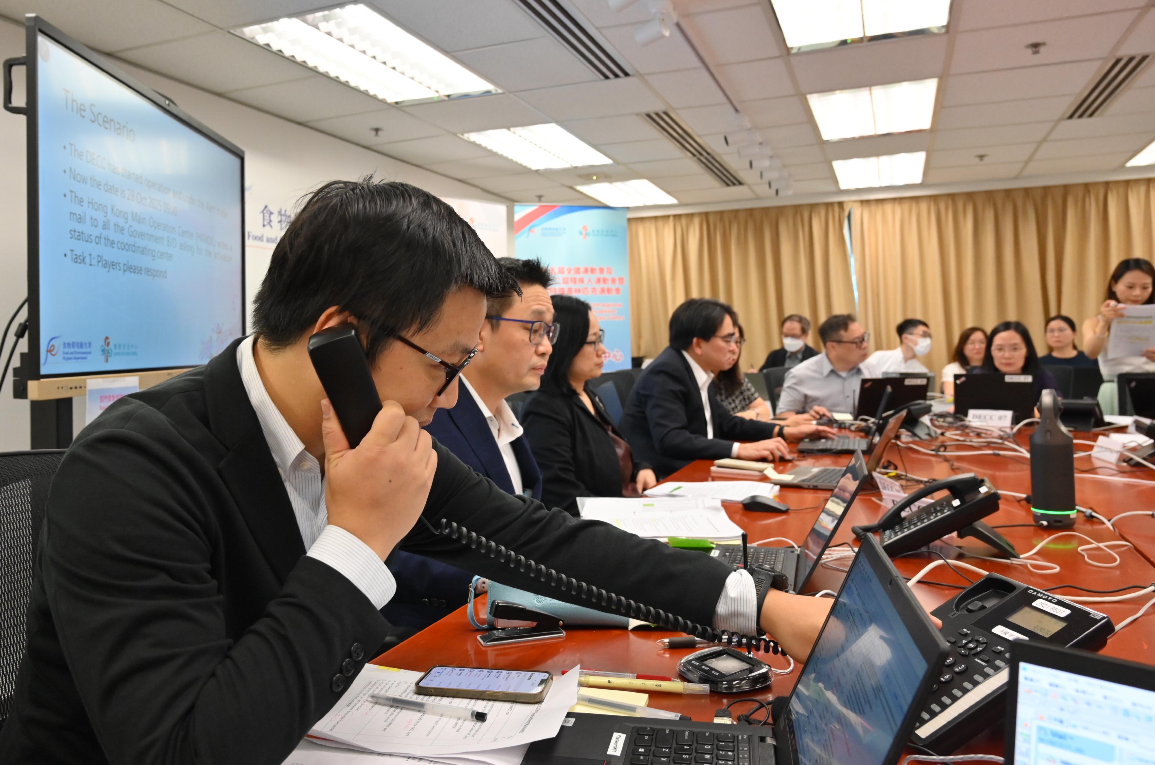 演習模擬在賽事期間接獲涉及運動會相關人員的懷疑食物投訴及中毒個案。食環署隨即按《應變計劃》全面啓動緊急協調中心,迅速在相關食肆作出調查,並採取控制措施,保障食物安全。緊急協調中心亦同時協調與全國運動會香港賽區統籌辦公室和其他相關單位的通報及協作。