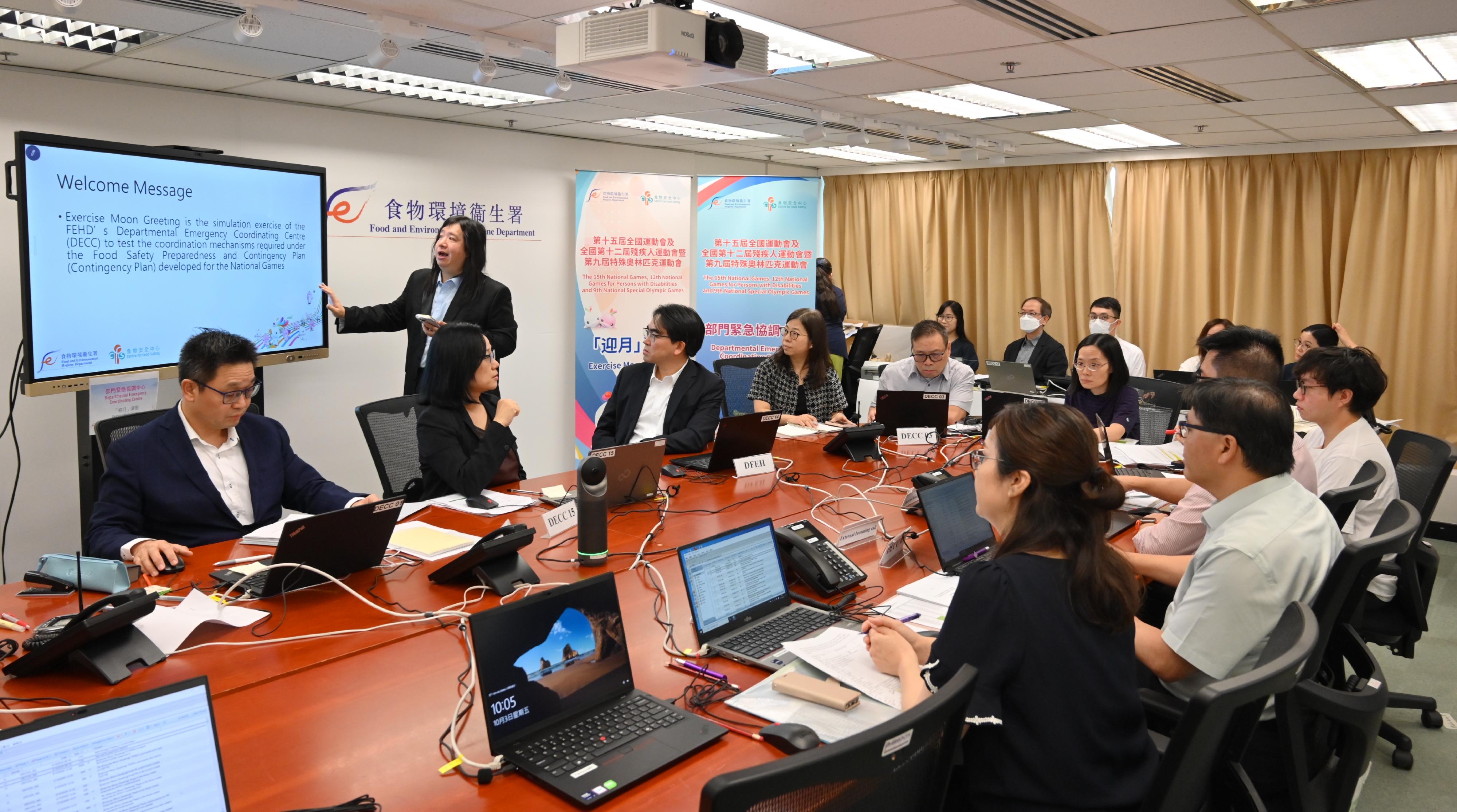 食物環境衞生署(食環署)今日(十月三日)舉行代號「迎月」的食物安全應變演習,以提升署方在第十五屆全國運動會(十五運會)和全國第十二屆殘疾人運動會暨第九屆特殊奧林匹克運動會(殘特奧會)期間,處理突發食物安全事件的協調及應變能力。共有約30名來自食環署、環境及生態局及全國運動會香港賽區統籌辦公室人員參與是次演習。