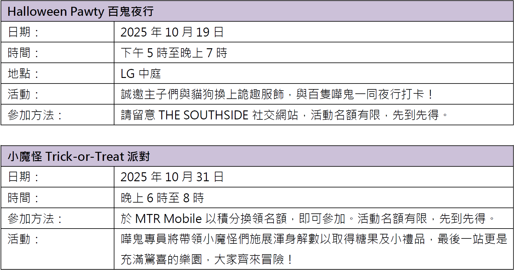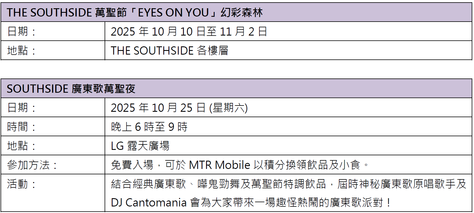 此外,THE SOUTHSIDE 在萬聖節期間還安排了豐富的現場活動。其中,10 月 25 日將舉辦「SOUTHSIDE 廣東歌萬聖夜」,活動特邀神秘廣東歌原唱歌手驚喜現身,這位歌手的作品在本地擁有頗高的傳唱度,其到場無疑將為活動增添更多亮點。當晚,商場還會供應萬聖節特調飲品,這些飲品不僅口感獨特,還融入了萬聖節的元素,讓市民能一邊欣賞演出,一邊暢飲暢玩;同時,商場更特別邀請專業舞蹈員及精心打扮的嘩鬼表演者,帶來一系列充滿節日氣息的特色舞蹈演出。主辦方誠摯歡迎大小朋友換上自己精心準備的創意萬聖服飾,一同參與到這場音樂與詭趣完美交融的萬聖節狂歡之中!具體活動時間表如下: