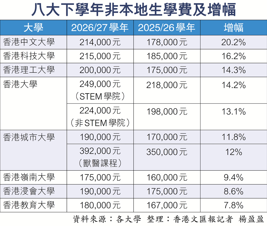 近日,各大學陸續發布2026/27學年招生詳情,香港文匯報觀察到,繼本學年後,八大下學年將再次全線調升非本地生學費。香港中文大學學費從17.8萬港元增至21.4萬港元,增幅達20.2%,為八大最高,且是連續兩年加費逾兩成,反映教學成本持續上漲的壓力。此外,香港科技大學及香港理工大學在調升一成多學費後,也已達到或超過20萬港元水平;香港大學則維持分科收費模式,STEM學院課程學費增至24.9萬港元,非STEM學院課程為22.4萬港元,凸顯學科資源投入的差異。