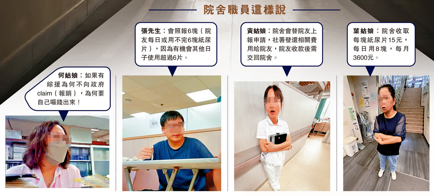 「我哋呢度實報實銷,向社署申報幾多,政府就會批返相應金額!」有院舍職員如此向家屬解釋。實際情況是,無論院友實際使用紙尿片的數量多少,院舍均以統一最高金額向社署申領,導致津貼最終落入院舍口袋;更令人不解的是,領取綜援的院友,普遍較非綜援院友需支付更高額的紙尿片費用,部分差額甚至高達一倍半,反映資助機制存在明顯漏洞。