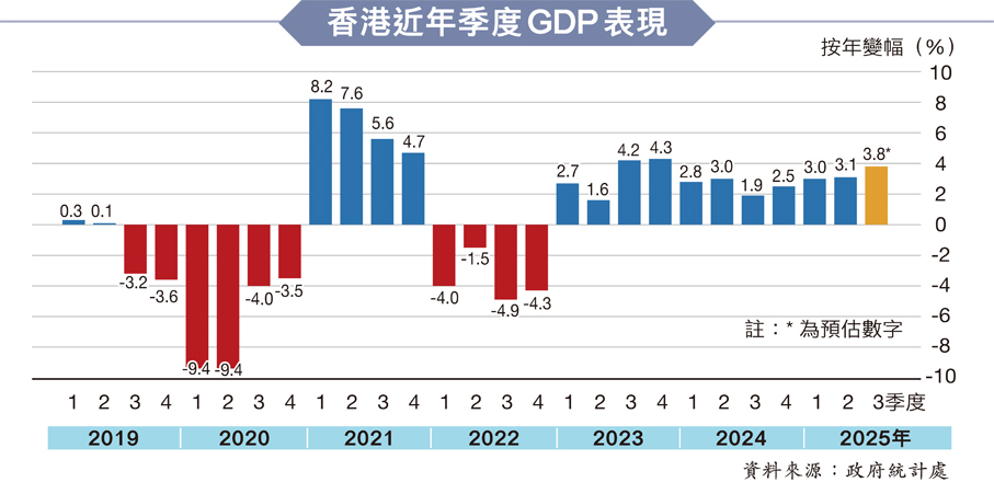 展望第四季,政府發言人表示多項積極因素將持續發酵:全球電子產品需求維持強勁、跨境金融市場活動日趨活躍、美聯儲重啟降息周期改善資產市場流動性,加上特區政府持續推動的經濟多元化措施,均構成支持經濟穩健增長的基礎。然而發言人亦提醒,國際貿易壁壘演變、地緣政治風險等外部不確定因素,仍需保持警惕。