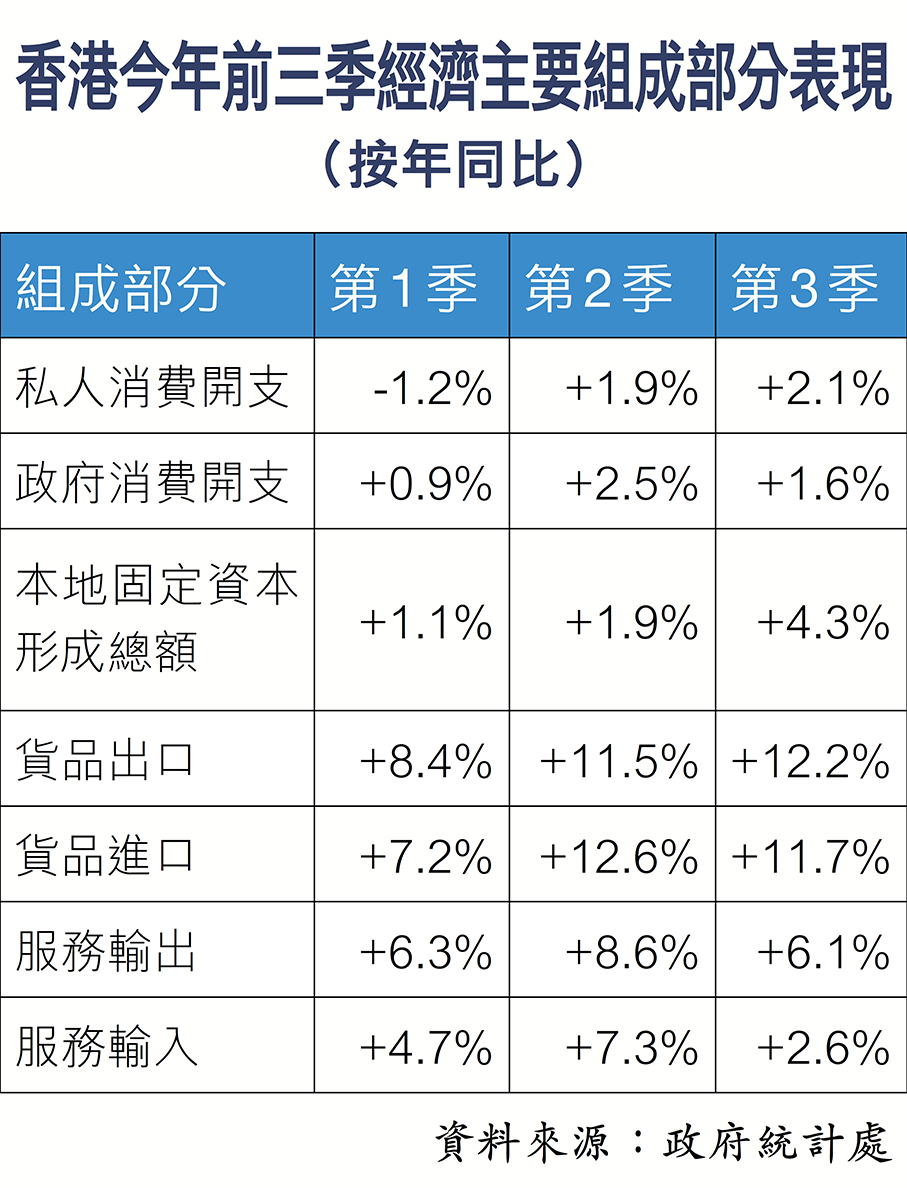 若細究GDP組成部分,今年第三季相較去年同期呈現全面向好態勢:私人消費開支增幅由第二季1.9%擴至2.1%;本地固定資本形成總額增速更從1.9%倍增至4.3%,反映企業投資信心回升;貨物出口總額增長12.2%,較上季11.5%進一步提升。值得注意的是,服務輸出雖維持6.1%的可觀增長,但較第二季8.6%有所放緩,顯示服務業復甦步伐存在分化。