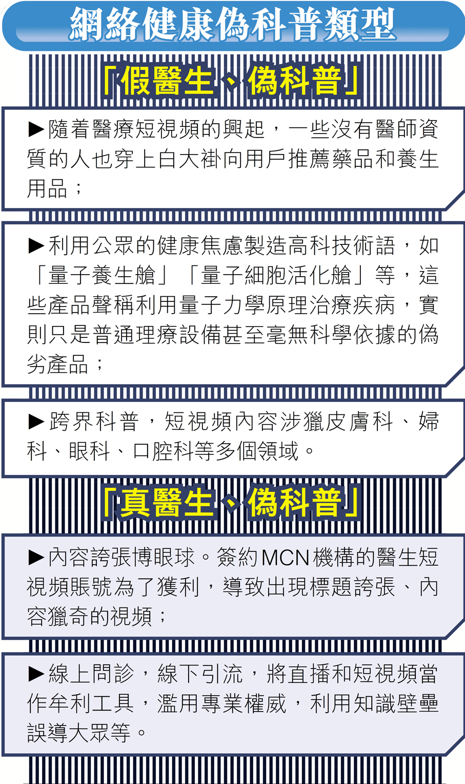 近年來,醫生通過直播和短視頻傳播健康科普知識成為常態,但其中也不乏濫用專業權威為自己背書、違規導醫診斷、線上問診、線下引流、直播帶貨甚至高價開藥的行為。中國傳媒大學教授陳欣鋼指出,當前的偽科普主要分為「假醫生、偽科普」和「真醫生、偽科普」兩種,兩種都值得關注。