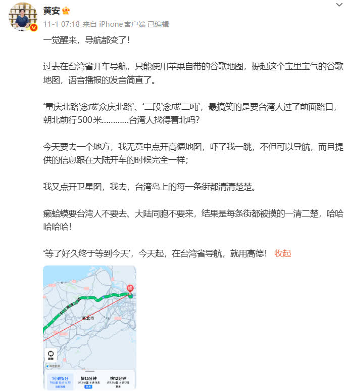 中国台湾省知名歌手兼主持人黄安近日在社交媒体连续发文,证实高德地图在台湾已实现全面导航功能。这位祖籍福建漳州的艺人表示,过去在台湾驾车只能使用苹果内置的谷歌地图,但常出现语音播报错误,例如将「重庆北路」误读为「众庆北路」,「二段」念成「二吨」,影响驾驶体验。