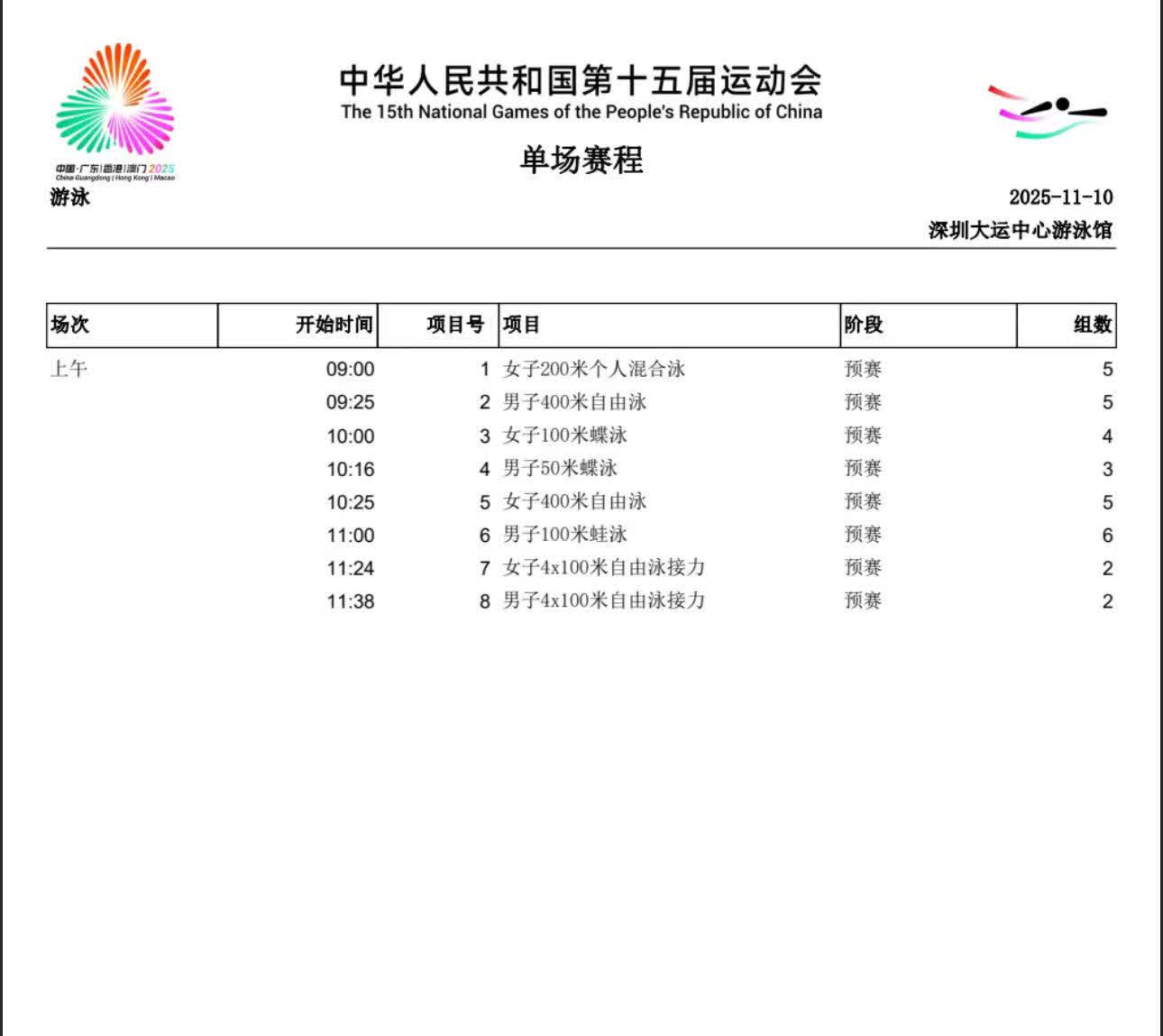 第十五屆全國運動會游泳項目今日(11月10日)正式拉開戰幕,首個比賽日將上演多場精彩預賽,包括男子400米自由泳、女子100米蝶泳及男子100米蛙泳等多個備受矚目的項目。國家隊星將潘展樂、汪順、覃海洋、孫楊、張雨霏及余依婷等均已準備就緒,勢必為爭奪決賽席位展開激烈角逐。與此同時,香港代表隊亦派出多名運動員參與多個項目,力爭在高手雲集的賽場上創造佳績。