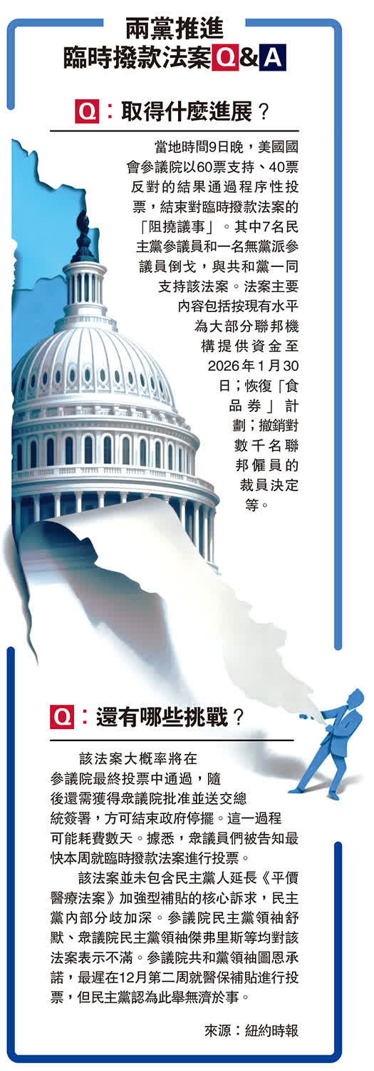 這項具里程碑意義的表決,為聯邦政府重啟鋪平道路。法案內容涵蓋三大重點:首先,將為多數聯邦機構提供資金至2026年1月30日,維持現有支出水平;其次,為農業部、退伍軍人事務部及軍事建設項目撥付整個財政年度預算;更關鍵的是恢復逾千萬民眾賴以為生的「補充營養援助計劃」(SNAP),並撤銷對數萬名聯邦雇員的裁員令。參議院預計最快於10日進行正式表決,由於眾議院由共和黨主導,通過前景樂觀。前總統特朗普亦在社交平台發文,稱「已非常接近終結停擺危機」。