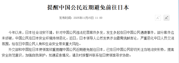中國外交部門與香港特區政府近日相繼發布對日安全警示,引發社會廣泛關注。根據中國駐日本大使館官網14日晚間發布的正式通告,外交部與駐日使領館已鄭重呼籲中國公民近期應避免前往日本。這項警示主要基於兩大關鍵因素:日本社會治安持續惡化對中國公民造成的直接威脅,以及日本領導人近期涉及台灣問題的爭議性言論對中日關係造成的負面影響。