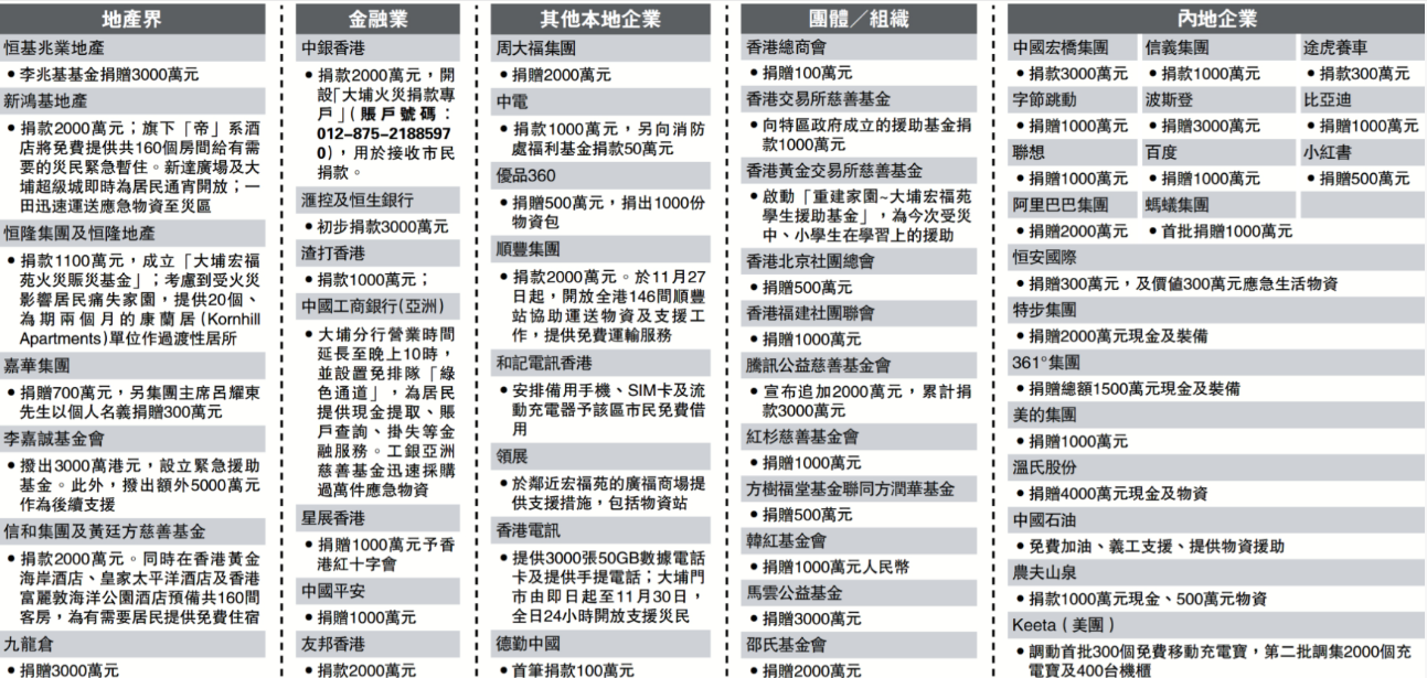大埔宏福苑發生罕見的五級大火,火勢猛烈導致嚴重傷亡,這場慘劇不僅震驚全港,更深深牽動著社會各界的惻隱之心。在災難面前,香港再次展現「一方有難,八方支援」的守望相助精神,社會各界、商界巨頭及慈善團體迅速響應,短短一日內已籌得超過7億港元善款(詳見附表)。這筆鉅款不僅是數字,更是一份沉甸甸的承諾,部分機構更不僅限於捐款,而是採取出錢又出力的雙軌策略,全方位支援受災家庭及傷者。有關資金將即時用於應急援助,協助災民渡過眼前難關,並將設立專項基金,全力支援災後漫長的家園重建工作,以及為社區的後續心理復原與設施修復提供堅實後盾。