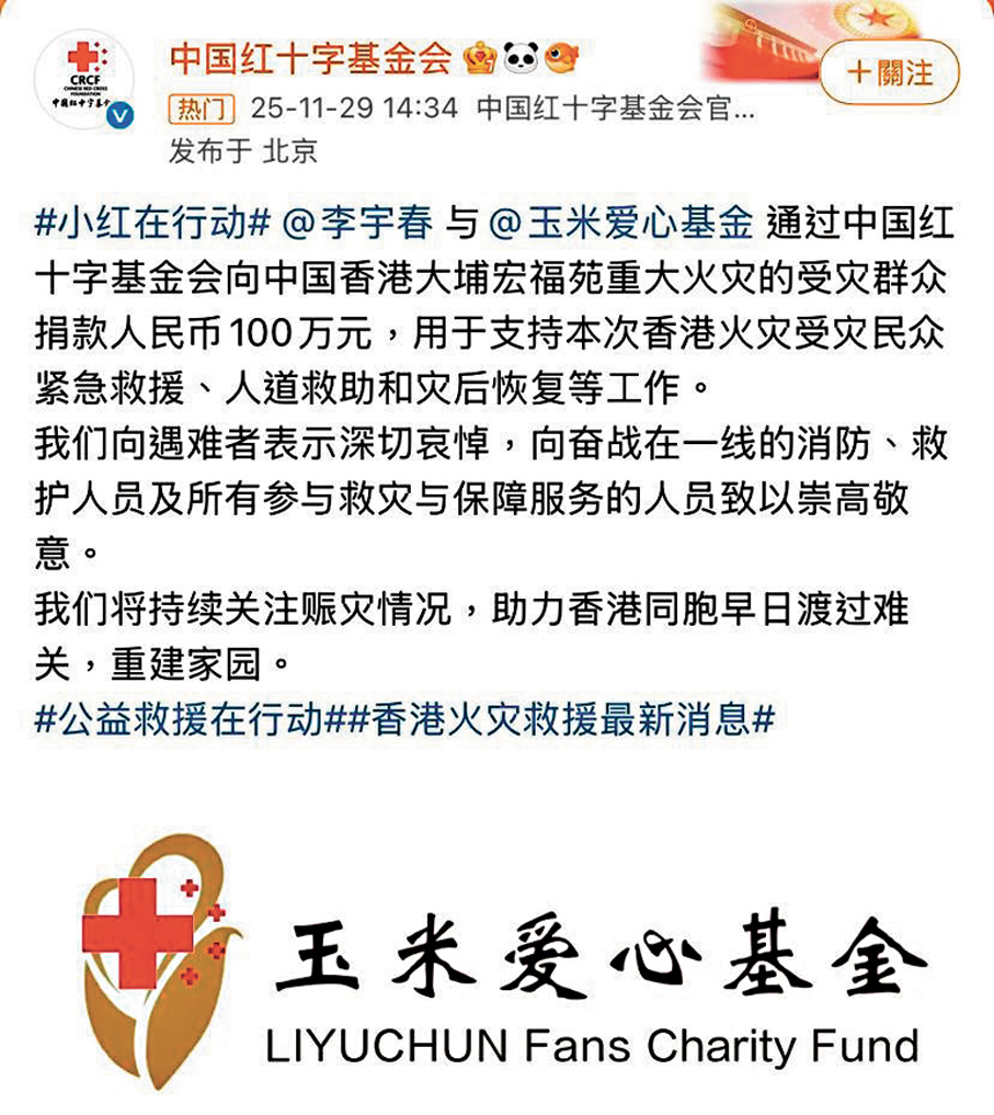 大埔宏福苑五級火災的悲劇持續令全港社會籠罩於沉重氛圍之中,各界紛紛伸出援手。演藝界展現強大凝聚力,不僅透過慈善節目《善心滿東華》迅速籌得1.18億港元,連同連日來各地藝人的捐獻,截至目前為止,演藝界為支援香港火災災民籌集的善款總額已突破2.15億港元。面對社會集體傷痛,歌手如楊千嬅與鄧紫棋均強調以音樂作為療癒力量,希望透過演出實現集體陪伴,與市民同心跨越逆境,賦予社群向前邁進的勇氣。