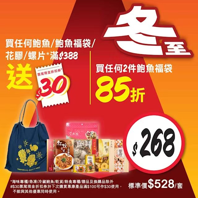 超市同時推出節日禮品優惠,例如官燕棧與LINE Friends聯名推出的刺繡福袋,以及白蘭氏冰糖燕窩與無糖燕窩系列,適合送禮或自用。惠康表示,冬至優惠將持續至本星期,鼓勵市民及早選購以享折扣。
