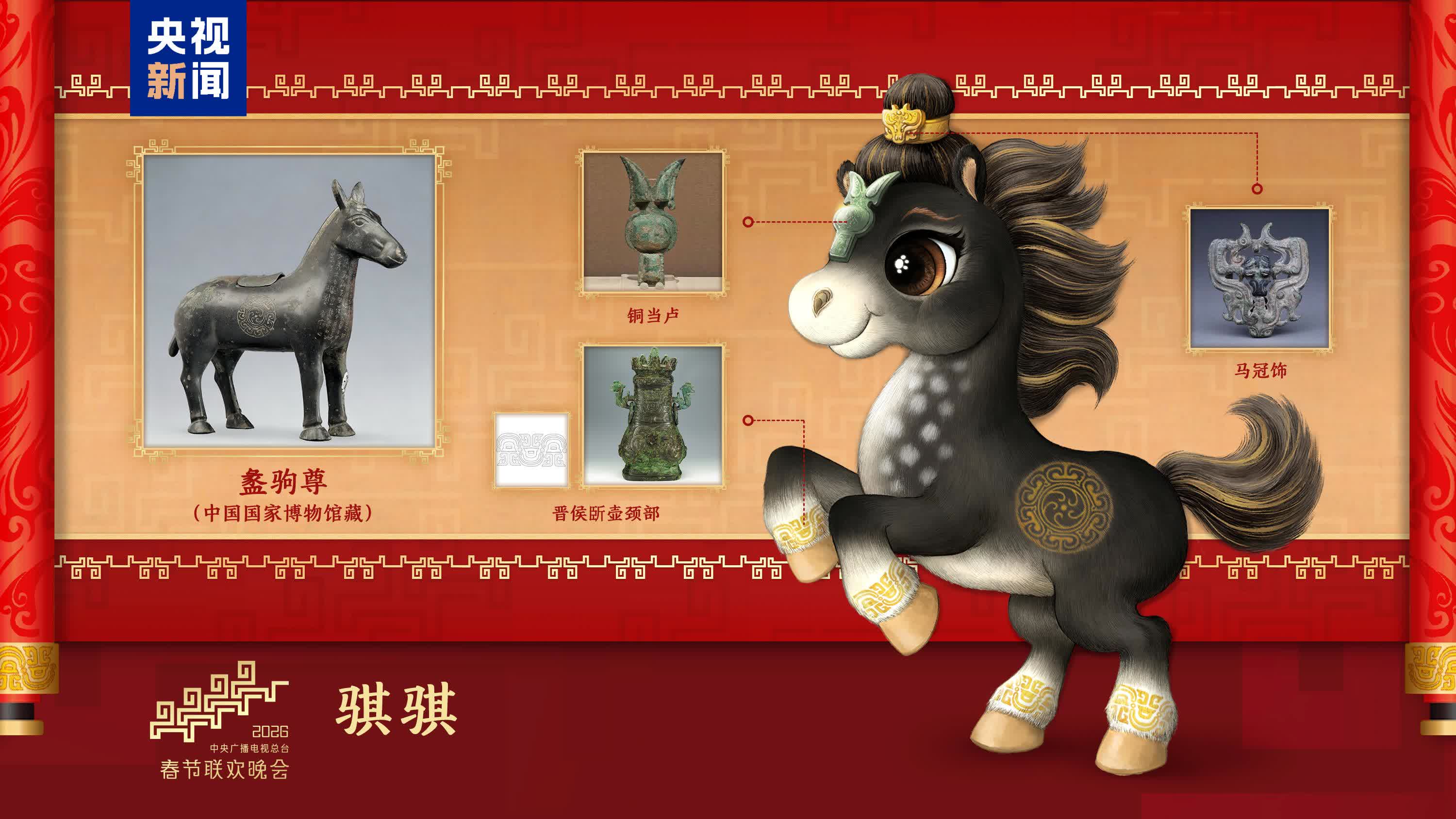 中央廣播電視總台於12月18日正式發布《2026年春節聯歡晚會》吉祥物形象。本次突破性地以四匹駿馬——「騏騏」、「驥驥」、「馳馳」、「騁騁」為一組,呈現活潑可愛、意氣風發的造型,與官方公佈的晚會主題「騏驥馳騁 勢不可擋」緊密呼應。值得關注的是,設計團隊深入考據中國歷代馬文化,將流雲紋、山雲紋等傳承千年的傳統紋飾巧妙融入造型,使吉祥物既蘊含深厚的歷史美感,亦展現萬象更新的時代氣息,整體設計寄寓馬到成功、前程似錦的節慶祝願。