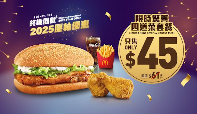 與此同時,麥當勞App亦同步推出新一輪限時驚喜——「$45四道菜套餐」。顧客可從雙層魚柳飽、板燒雞腿飽或巨無霸超值套餐中任選一款做主菜,並搭配脆香雞翼(2件),以超值價一次過享受多重滋味。該組合相當於以優惠價同時擁有飽類主食、薯條、飲品及小食,性價比頗高。
